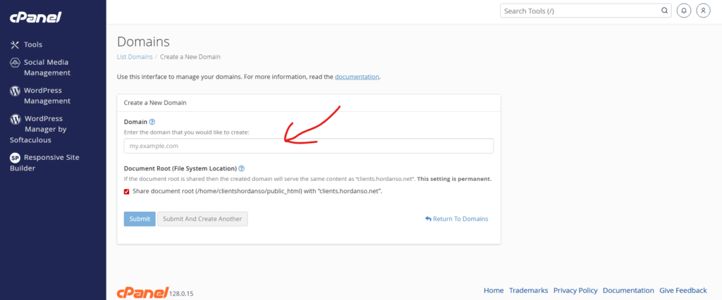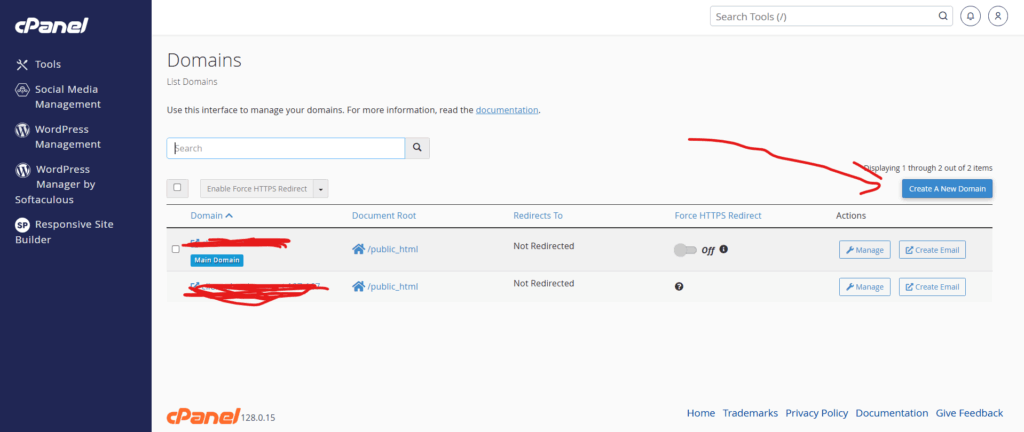 Once inside cPanel, look for the “Domains” section and click “Create a New Domain”.